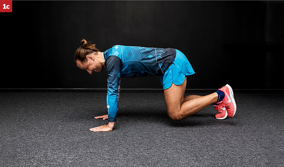 Pozycja wyjściowa: klęk podparty. Ustaw kolana pod biodrami na ich szerokość, palce stóp zadarte o podłoże, dłonie pod barkami na ich szerokość, głowa w przedłużeniu linii tułowia, a wzrok skierowany w dół (fot. 1a).