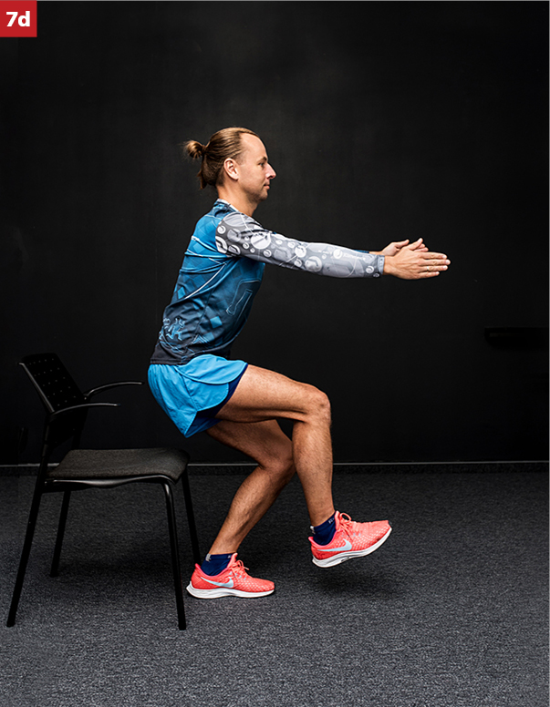 Stopnie utrudnienia: ten sam cel stabilizacji stawu kolanowego można uzyskać, wykonując półprzysiad jednonóż do pozycji krzesła i powrót z utrzymaniem osi kończyny dolnej podporowej (fot. 7c, d). Pamiętaj, aby w trakcie zejścia do półprzysiadu stopniowo zginać stawy biodrowe i pochylać tułów do przodu.