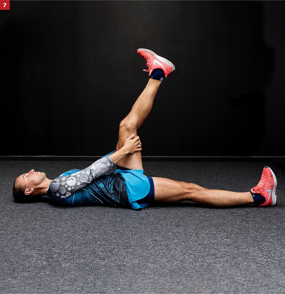 Pozycja: połóż się na plecach. Zegnij jednocześnie staw biodrowy i kolanowy do kąta 90 stopni i złap pozycję rękami, zaplatając palce pod kolanem tej nogi. Nie podciągaj barków w kierunku ucha oraz nie odrywaj głowy od podłoża. Nie zmieniając pozycji uda, prostuj staw kolanowy do pojawienia się odczucia ciągnięcia na przebiegu mięśni tylnej części uda i podudzia (fot. 7). Utrzymaj pozycję 10-15 sekund, a następnie zegnij staw kolanowy, niwelując odczucie ciągnięcia, i zmień stronę.